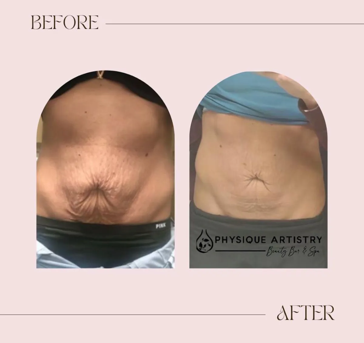 Body sculpting targets and kills fat cells in the body without surgery. It allows you to shape and lose stubborn fat in areas such as the upper arms, abdomen, hips, and thighs.